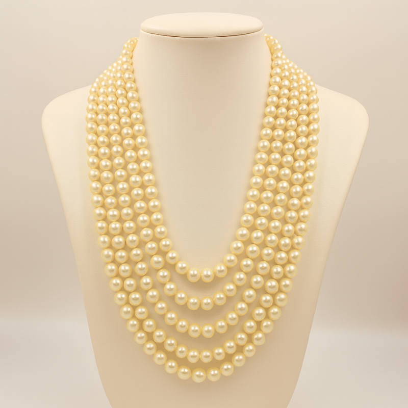 Crafted from radiant 8.40 mm cultured pearls in a soft golden hue, this five-line mala is the epitome of opulence and refinement. The uniform size and shine of each pearl give the piece a harmonious drape across the chest, making it a powerful statement of grace and grandeur.