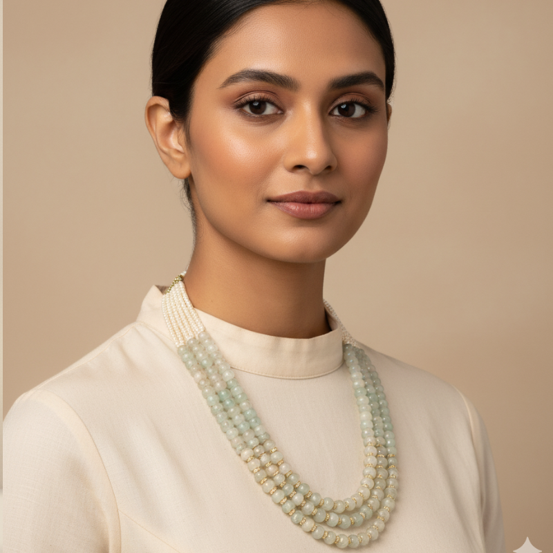 Emerald Beadswith Pearls Mala is a handcrafted statement piece, made with carefully selected beads that exude timeless charm. The structure and arrangement of this mala ensure a graceful drape, whether worn with traditional attire or modern ensembles.