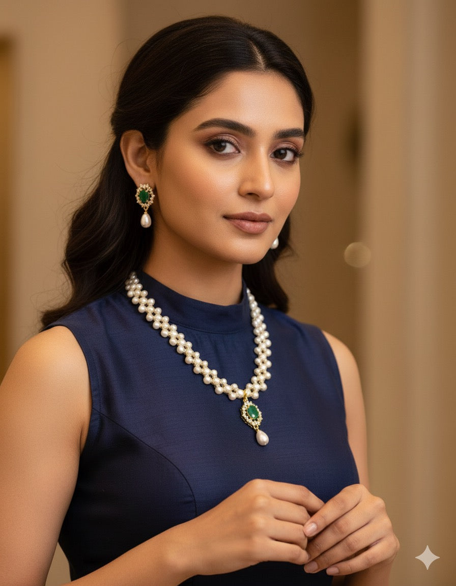 A tribute to nature's most luxurious colours. The "Emerald Pearl Set" is a breathtaking ensemble featuring the timeless elegance of pearls and the vibrant saturation of green gemstones.