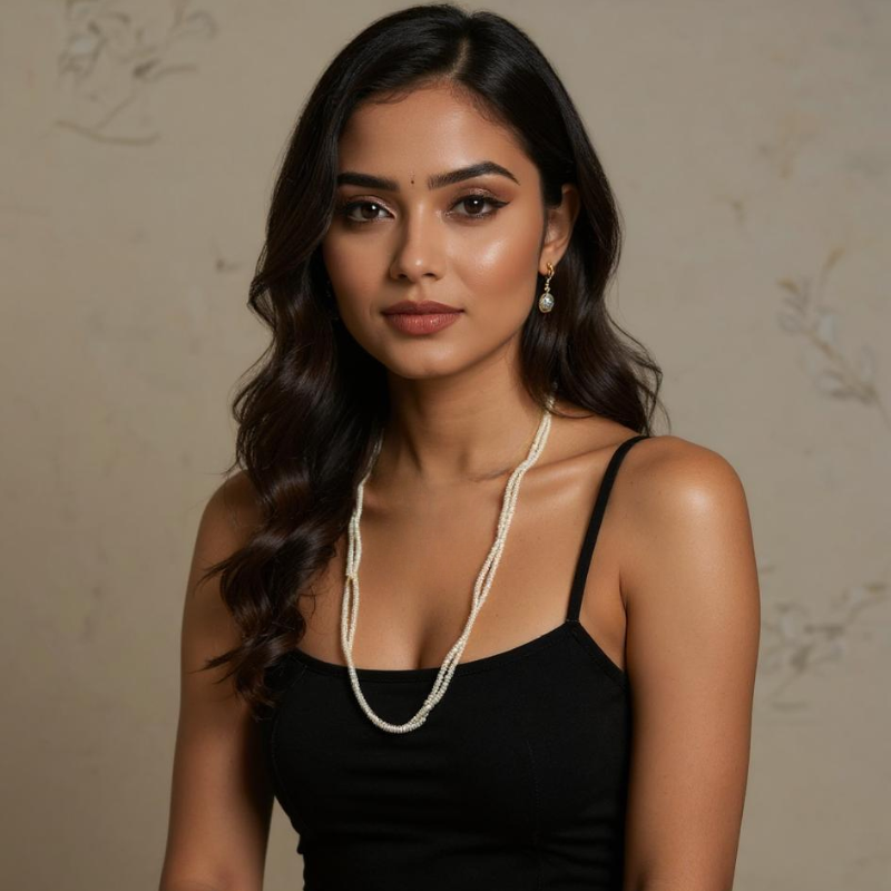 This minimalist 2-line mala features 3.4 mm flat freshwater pearls in an off-white tone, hand-strung for a smooth, even fall. The flat pearls catch the light softly across their broad surface, offering a delicate sheen that pairs effortlessly with both festive and daily ethnic wear.