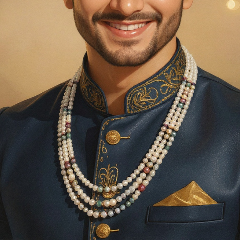 Crafted with 4.20 mm flat freshwater pearls, this 3-line mala is an ode to quiet beauty with a touch of sparkle. Each strand is symmetrically hand-strung, combining the soft lustre of white flat pearls with the gentle contrast of minimal bead accents. The result is a necklace that feels fluid, clean, and contemporary — while staying rooted in Indian heritage.