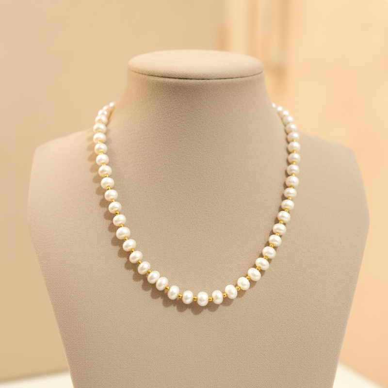 This single-line mala blends the calm elegance of 7.50 mm flat white freshwater pearls with the luxurious accent of gold-toned beads. The flat pearls create a smooth surface texture that lies comfortably against the skin, while the interspersed golden elements add warmth, richness, and festive charm.