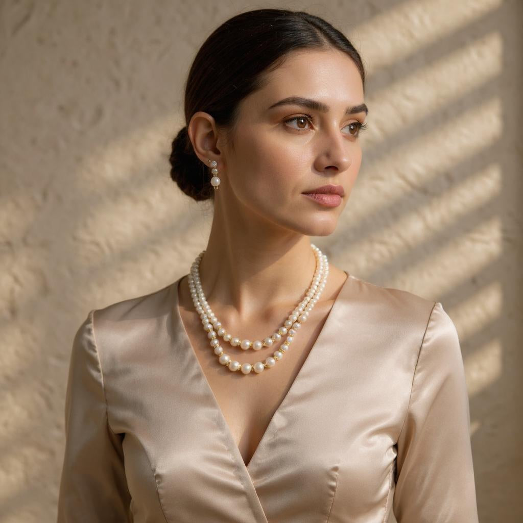 This two-line mala brings together 5.45 mm white flat freshwater pearls and 8.40 mm grey pearls in a smooth, alternating pattern. The interplay between the crisp white and soft grey tones adds visual dimension and a contemporary elegance, making it a standout piece for modern ethnic styling.