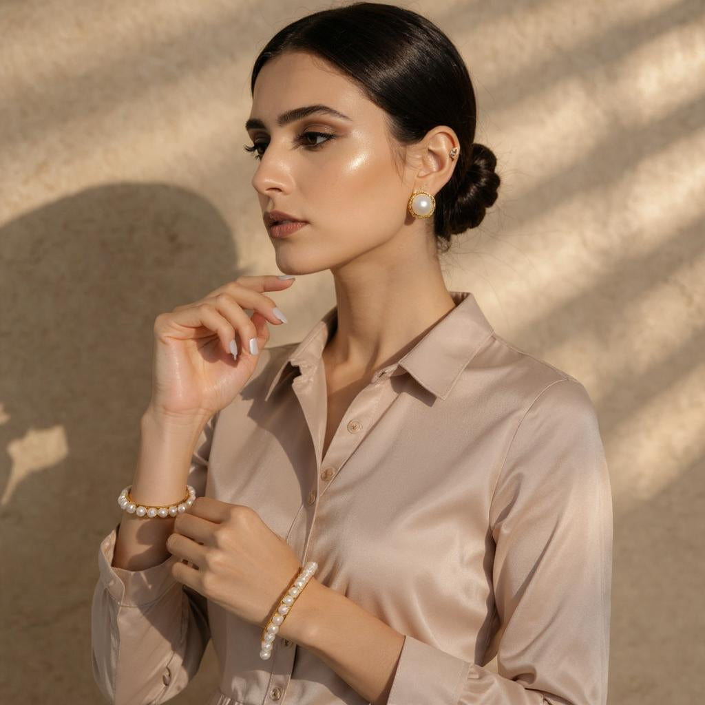The Flat Pearls with Emerald Beads Bangle (B-6386) combines soft 5.00 mm white freshwater pearls with elegant emerald-colored bead accents — bringing out a gentle yet festive contrast. The flat shape of the pearls ensures comfort and elegance, while the subtle green beads infuse the piece with cultural richness and a celebratory vibe.