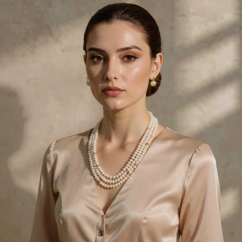 This 3-line mala is made from 5.5 mm flat white freshwater pearls, offering a clean, radiant profile that sits beautifully along the neckline. The flat shape of each pearl allows for a broader light reflection, giving this piece a soft luminosity without the need for embellishments. The three-strand layout adds volume and elegance while still feeling feather-light on the skin.