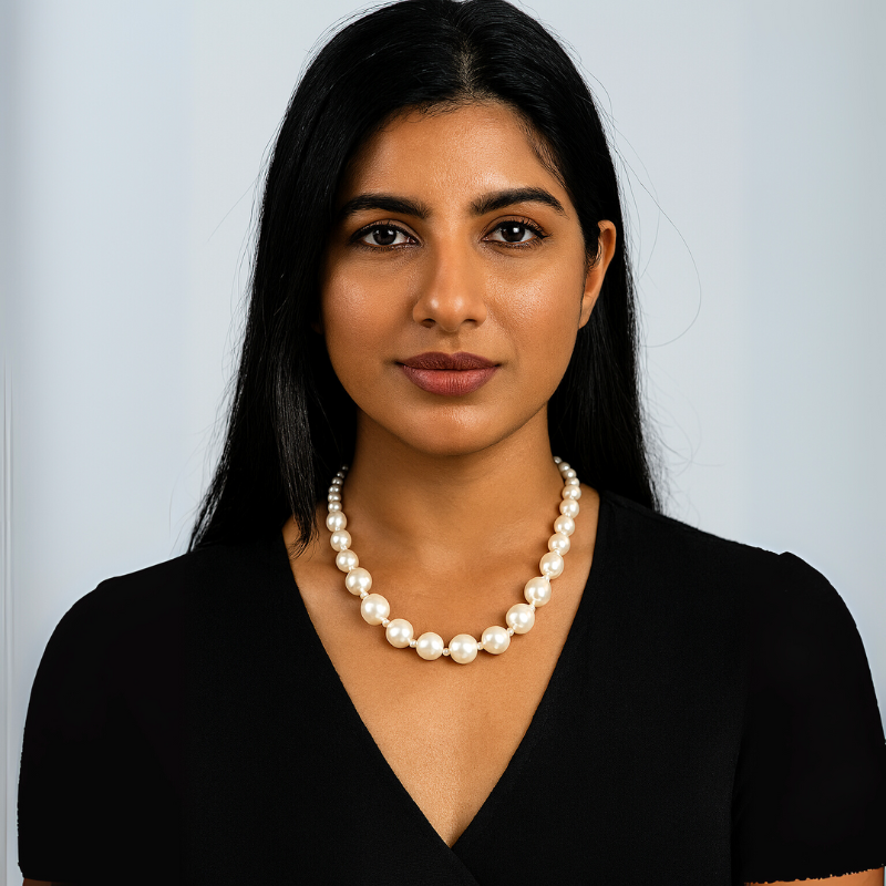 This handcrafted mala beautifully merges two distinct pearl shapes — bold round pearls (13.20 mm) and slender rice pearls (4.20 mm) — to create a dynamic and textured piece that feels both structured and fluid. The design plays with scale and silhouette, giving the necklace depth and presence without overwhelming the neckline.
