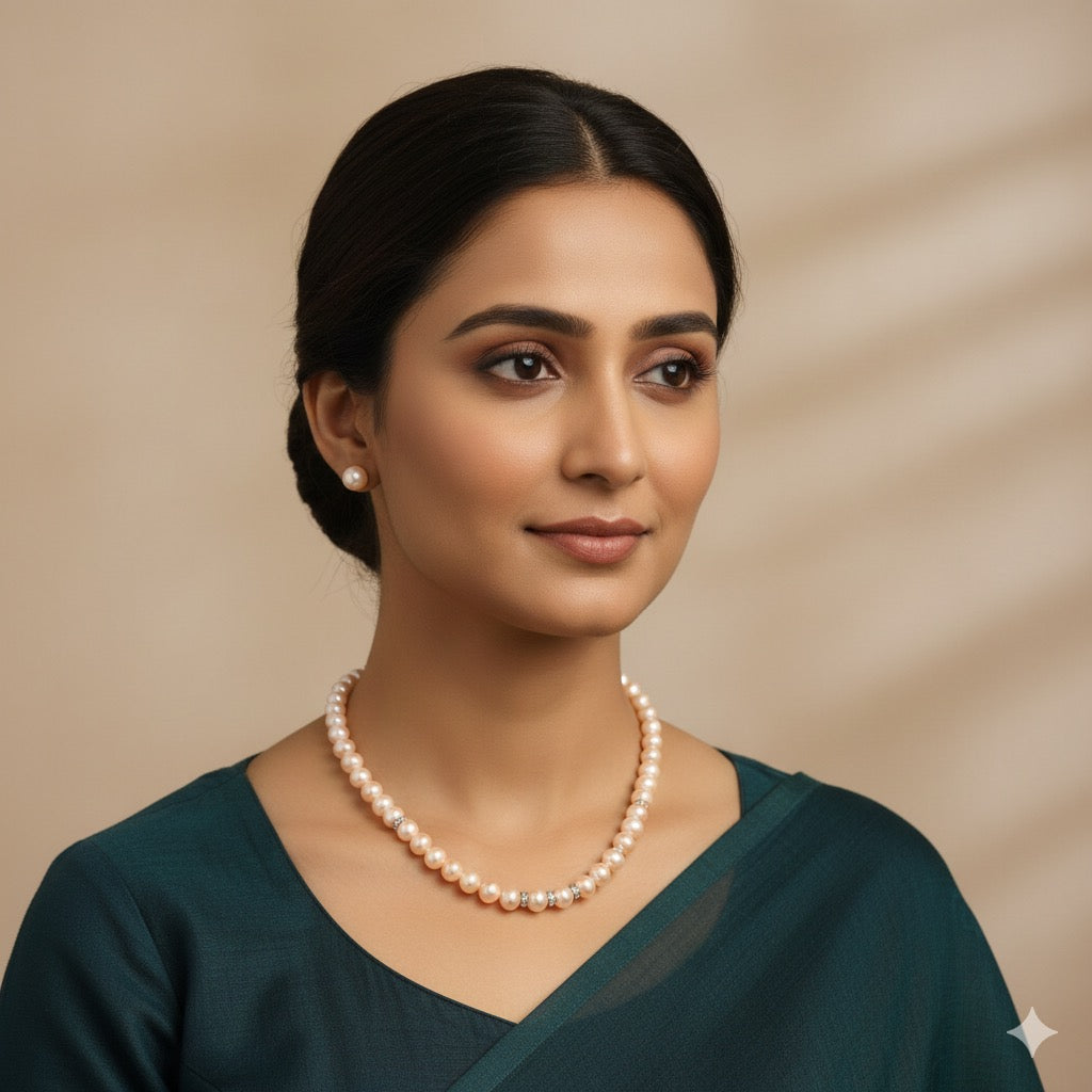 The 6.5MM size offers a delicate, sophisticated drape, perfect for layering or wearing as a single, chic statement. The glittering accents catch the light with every movement, adding a subtle sparkle that elevates this piece far beyond a traditional pearl necklace. This Mala is ideal for adding a luxurious, feminine touch to both traditional Indian wear and modern cocktail attire.