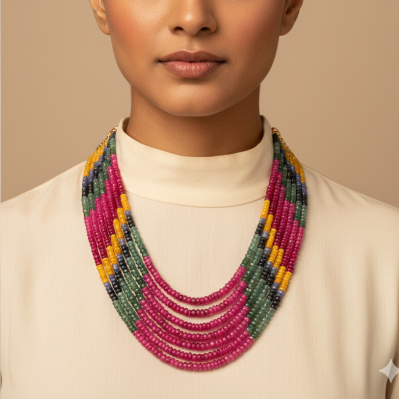 Malti Coiour Mala is a handcrafted statement piece, made with carefully selected beads that exude timeless charm. The structure and arrangement of this mala ensure a graceful drape, whether worn with traditional attire or modern ensembles.