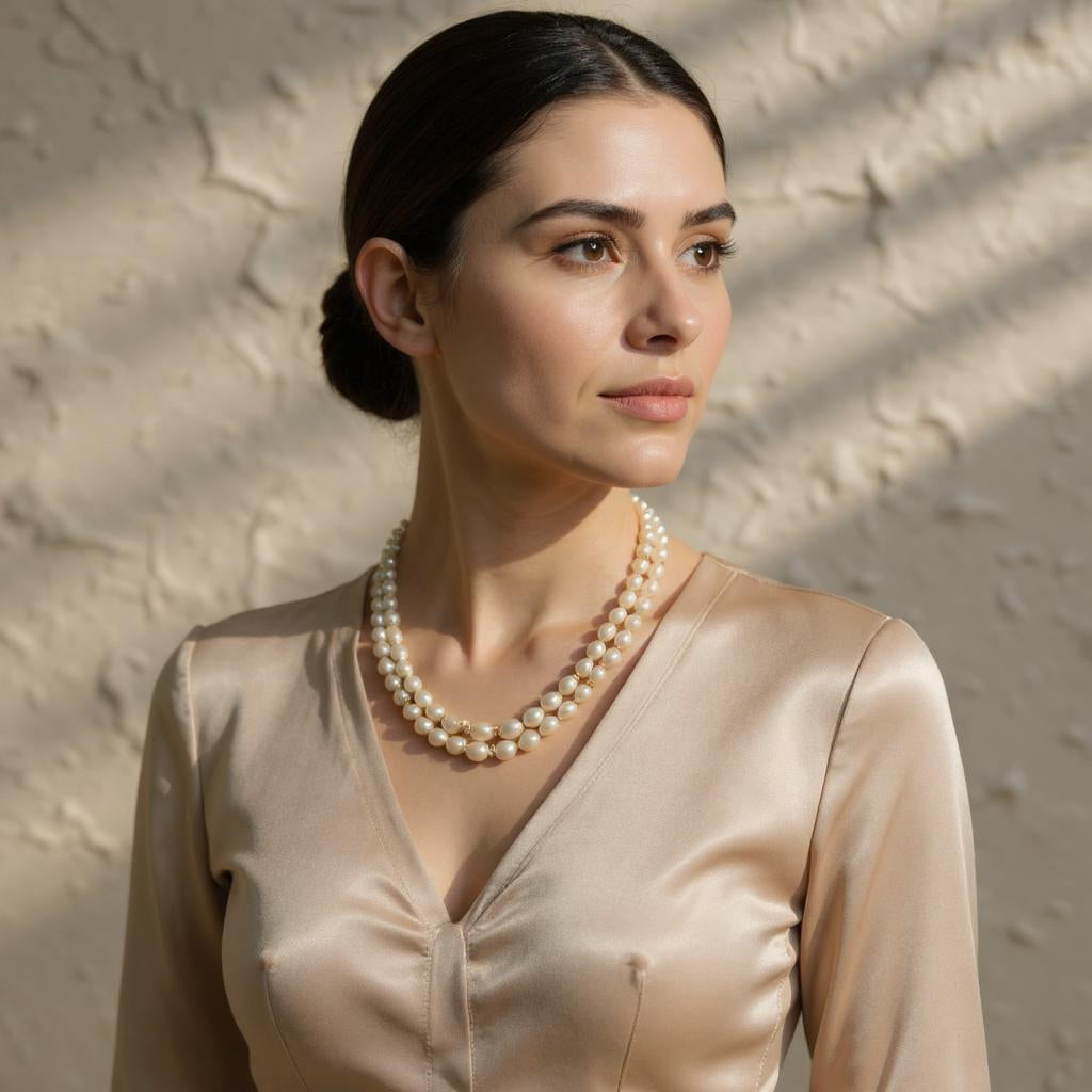 The elongated rice pearl shape adds a soft texture, while the two-layer layout offers enhanced presence without weight. It’s an ideal piece for women who seek ceremonial sophistication or a graceful addition to bridal, festive, or spiritual attire.