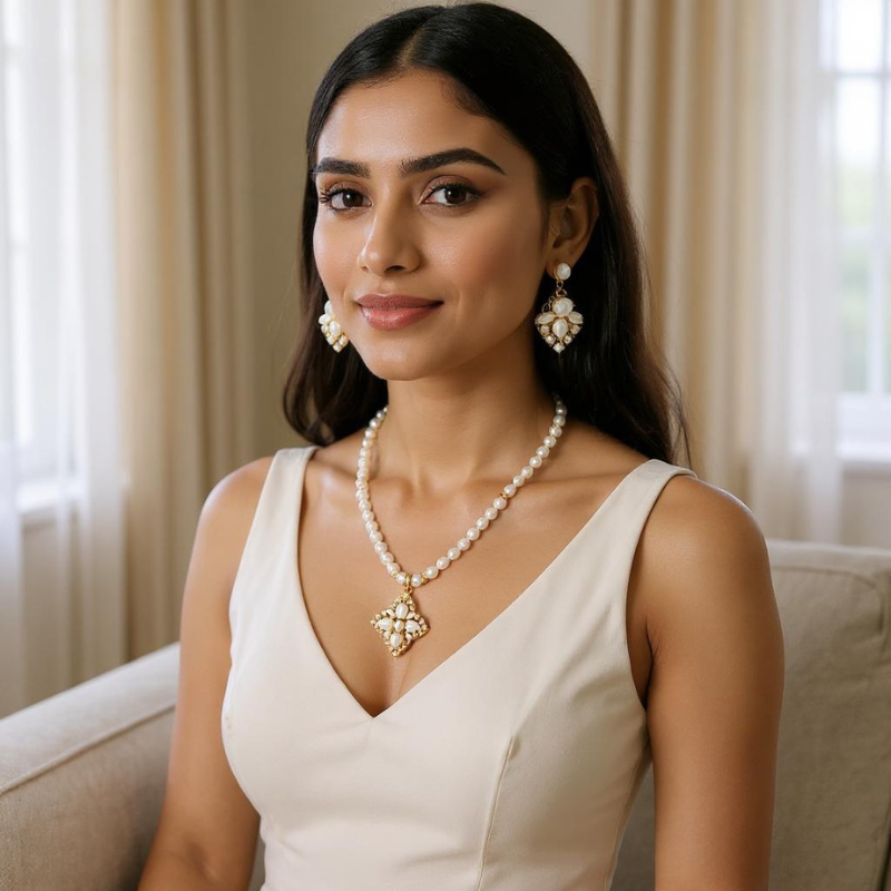 This single-line pendant set is made from 7.55 mm rice pearls — smooth, classic, and ever so gentle in their design. The freshwater pearls drape softly across the collarbone, while a central pendant adds just the right amount of presence.