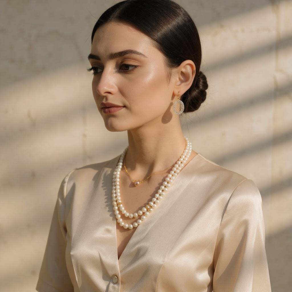 This two-line mala features an exquisite combination of white rice pearls (6.00 mm) and soft pink round pearls (8.60 mm), creating a subtle play of shape and color. The dual tones add a touch of feminine charm, while the alternating design lends movement and character to the piece.