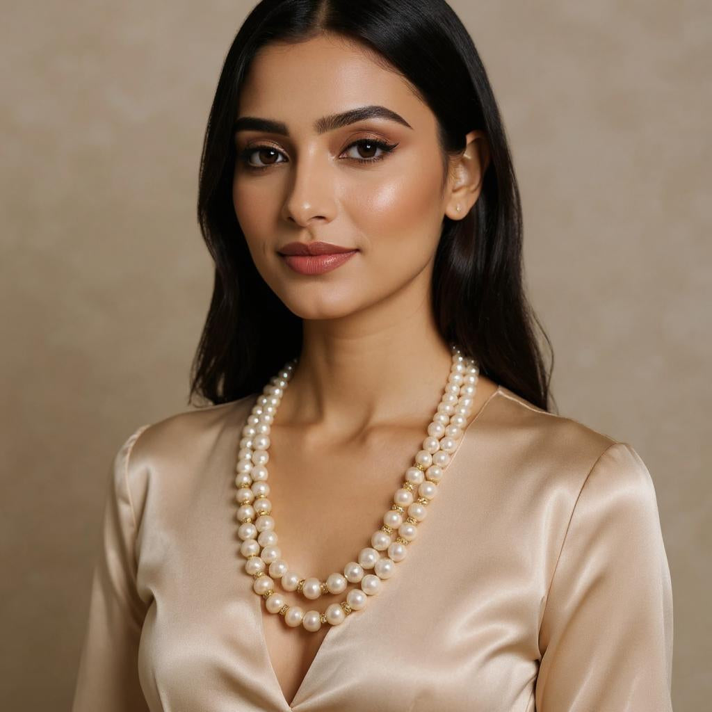 This elegant two-line mala features white freshwater round pearls, graduating from 9.60 mm to 5.90 mm in size. The design uses the "Adrings" layout for a neat, structured flow that enhances the drape and presence of each strand. The smooth round pearls create a soft lustre that reflects light with every movement, offering an ideal mix of traditional grace and balanced volume.
