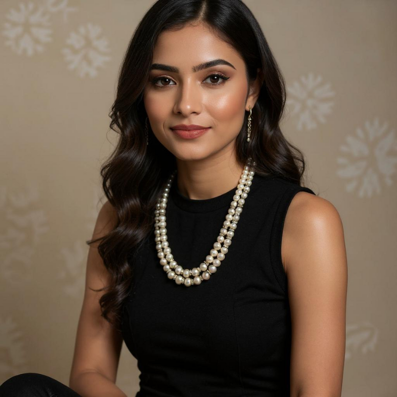 Crafted with white freshwater round pearls ranging from 8.20 mm to 4.20 mm, this two-line mala is designed in the Adrings format — allowing each pearl to sit with perfect alignment and spacing. The graduation from larger to smaller pearls enhances the silhouette, giving it a natural taper that feels both elegant and regal.