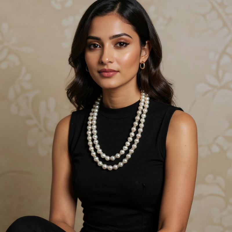 Crafted from 8 mm round freshwater pearls, this 2-line mala is a timeless staple — refined and versatile. The natural symmetry of round pearls provides a polished look, and the double strand adds volume without being overwhelming. The soft white hue enhances every complexion, making it ideal for daily pooja, spiritual gifting, or understated festive wear.
