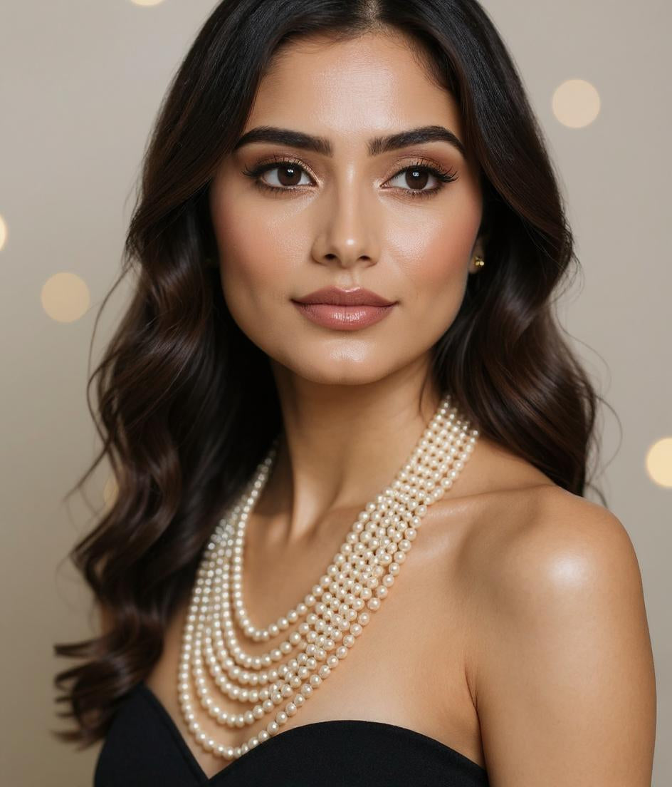 This 7-line mala is crafted with 4.60 mm round freshwater pearls, offering graceful volume without overpowering the wearer. Each strand is hand-aligned with symmetry and care, creating a soft cascade of pure white pearls that drape like devotion over the neckline.