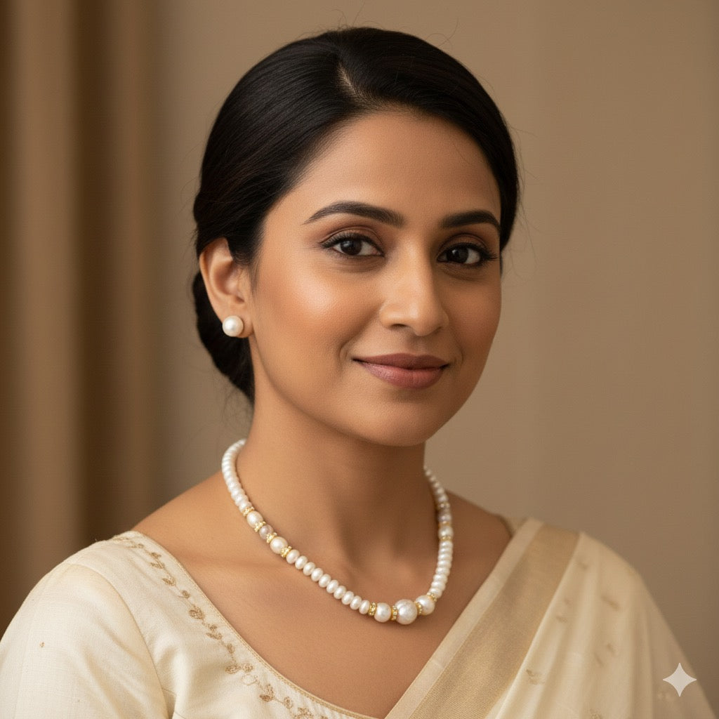 Adorn yourself with the majestic charm of the Royal Radiance Pearl Mala. This stunning necklace is a celebration of luxurious contrasts, combining the timeless purity of white freshwater cultured pearls with the opulent gleam of gold-toned accents.