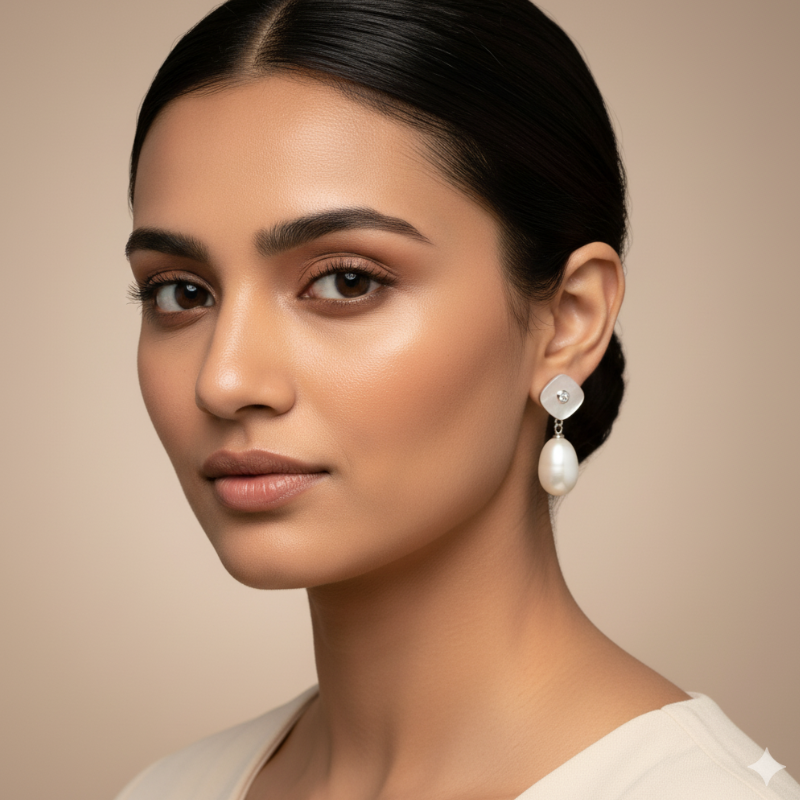 Each earring is adorned with a minimalist stud — shaped in a delicate cushion square, highlighted with a shimmering crystal at the center. The classic white oval pearl drop completes the look with its subtle sheen and fluid silhouette.