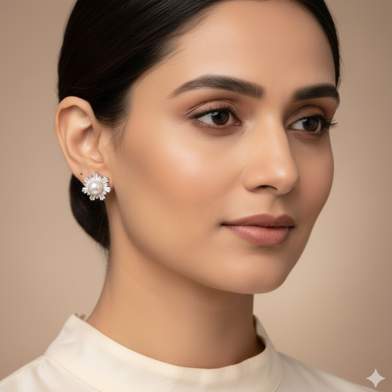 Add a burst of brilliance to your collection with the Silver Sunburst Pearl Tops — a piece that embodies luxury, elegance, and luminous charm. At the center lies a perfectly round freshwater pearl, embraced by a radiant halo of tapered baguette zircon stones set in a 360° starburst pattern.